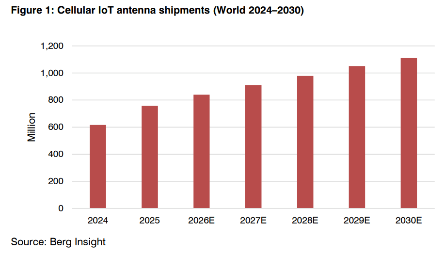 - Berg Insight schätzt die weltweiten Lieferungen zellulärer IoT-Antennen für 2025 auf 757 Millionen Einheiten – ein Wachstum von 23 Prozent gegenüber dem Vorjahr – und prognostiziert bis 2030 eine weitere Steigerung auf 1,1 Milliarden Einheiten (CAGR 7,9 Prozent).