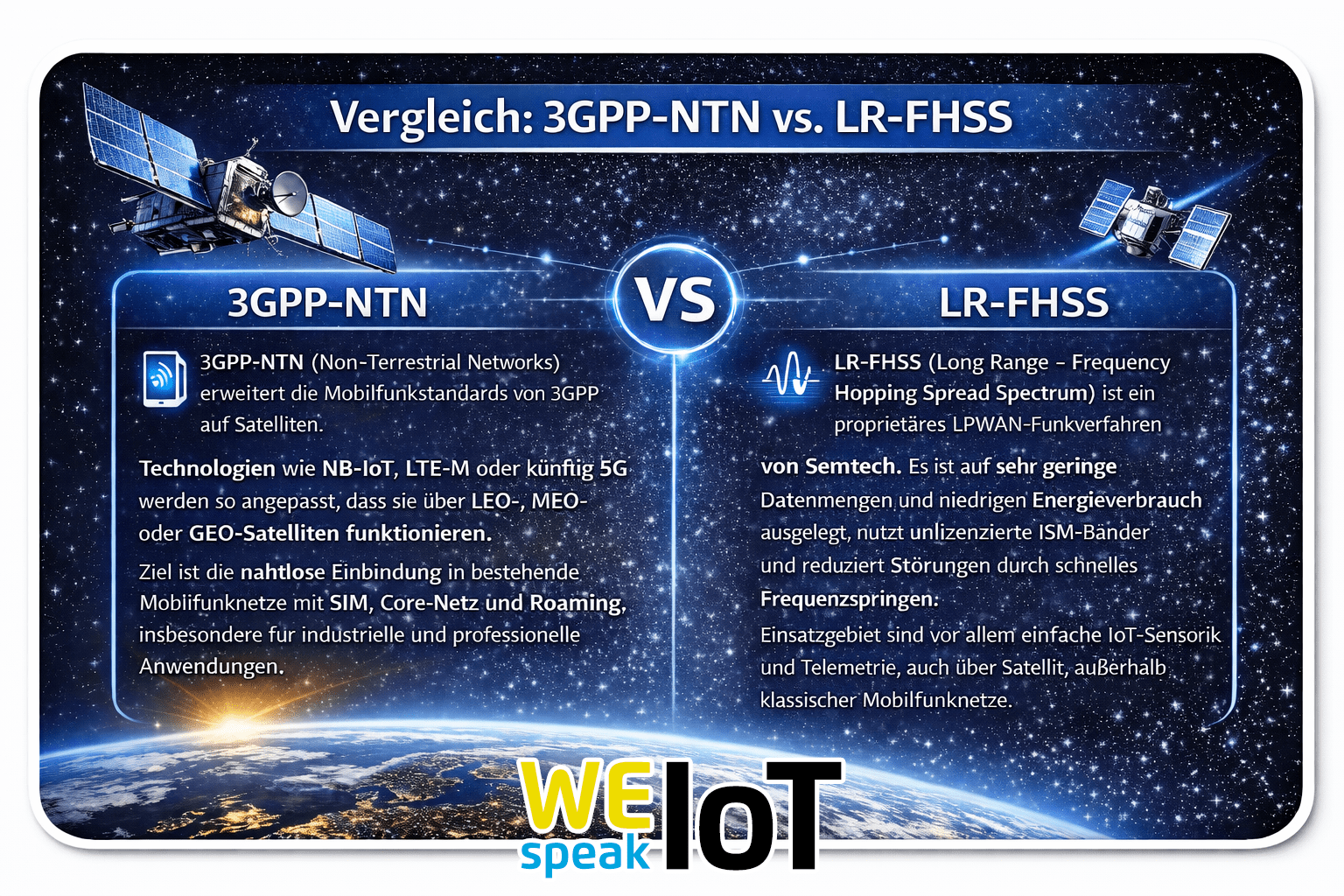 Neben 3GPP-standardisierten 5G-NTN-Ansätzen gewinnen auch alternative Verfahren für schmalbandige IoT-Kommunikation über Satellit an Bedeutung. Dazu zählt unter anderem LR-FHSS (Long Range – Frequency Hopping Spread Spectrum) von Semtech. Europäische Start-ups wie Fossa Systems (Spanien), Lacuna Space (Großbritannien) und Plan-S (Türkei) zählen zu den Akteuren, die LR-FHSS für satellitengestützte IoT-Anwendungen einsetzen oder erproben.